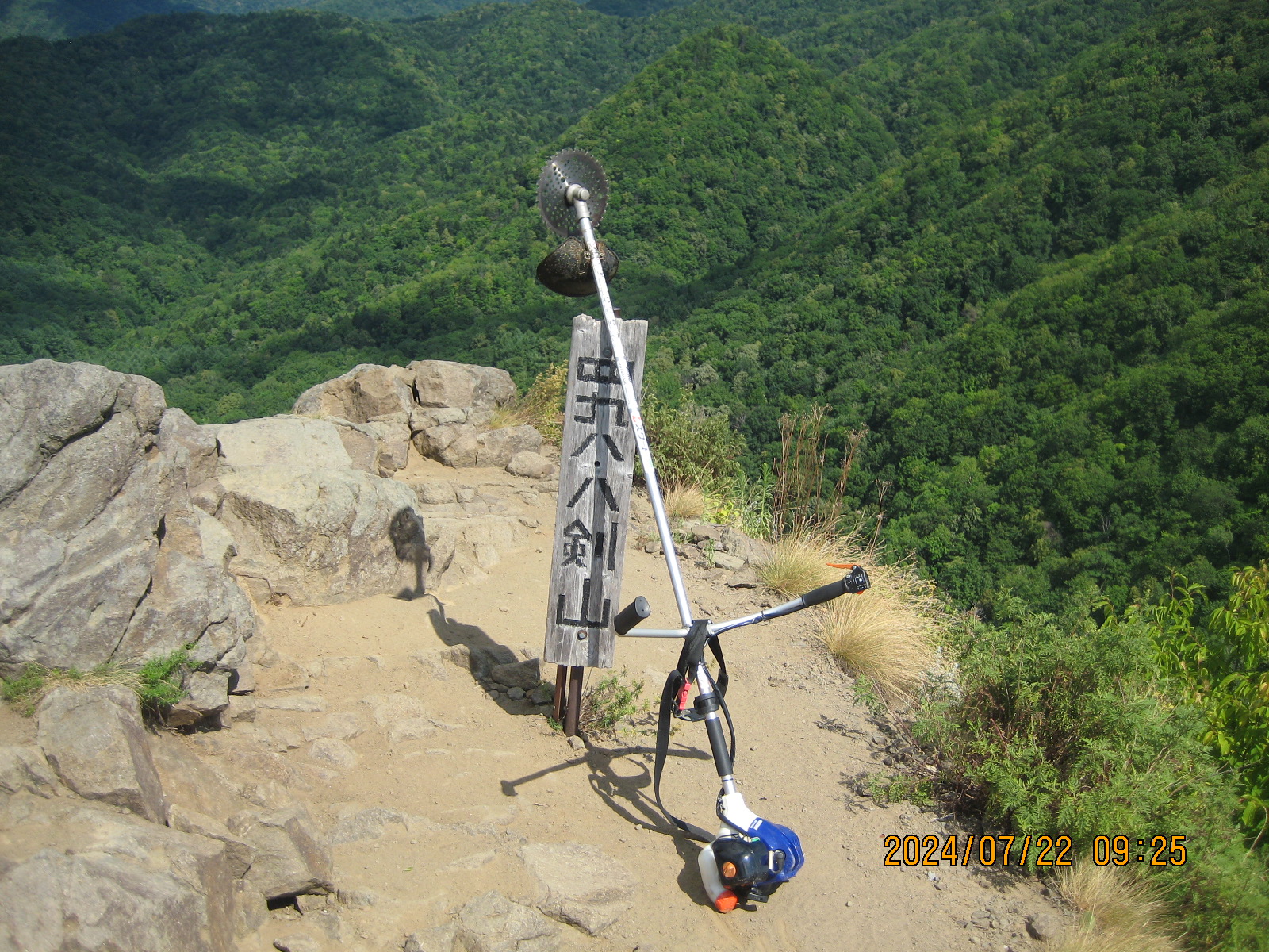 八剣山 登山開始7時55分 登頂9時25分 下山9時55分。 今日もクソ暑いなー と思いながらも草刈り機を担いで登山道の整備をして来ました。 刈った草は明日レーキを持って掃除をする予定です。 樹液を吸っている写真のはコガネムシさんかいな? ピカ―ッと光ってたね。