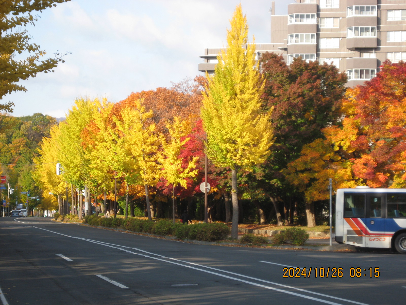 八剣山 登山開始13時32分 登頂14時10分 下山14時40分。 紅葉真っ盛りの土曜日で好天と来てるから登山者さんがわんさかワンサカ。 オラはというと一週間ぶっ続けの仕事で、今日も昼までバスに乗務していたんだわ。 来週火曜日からは何日か休みになりそうなので登れなかった分を取り戻したいと思っています。 8合目の冬用ロープを張ってみましたが、ちょっと緩いのでその内修正したいと思います。 八剣山には関係ないけど地下鉄真駒内駅のイチョウ並木が綺麗なのでチョイと写真をね。