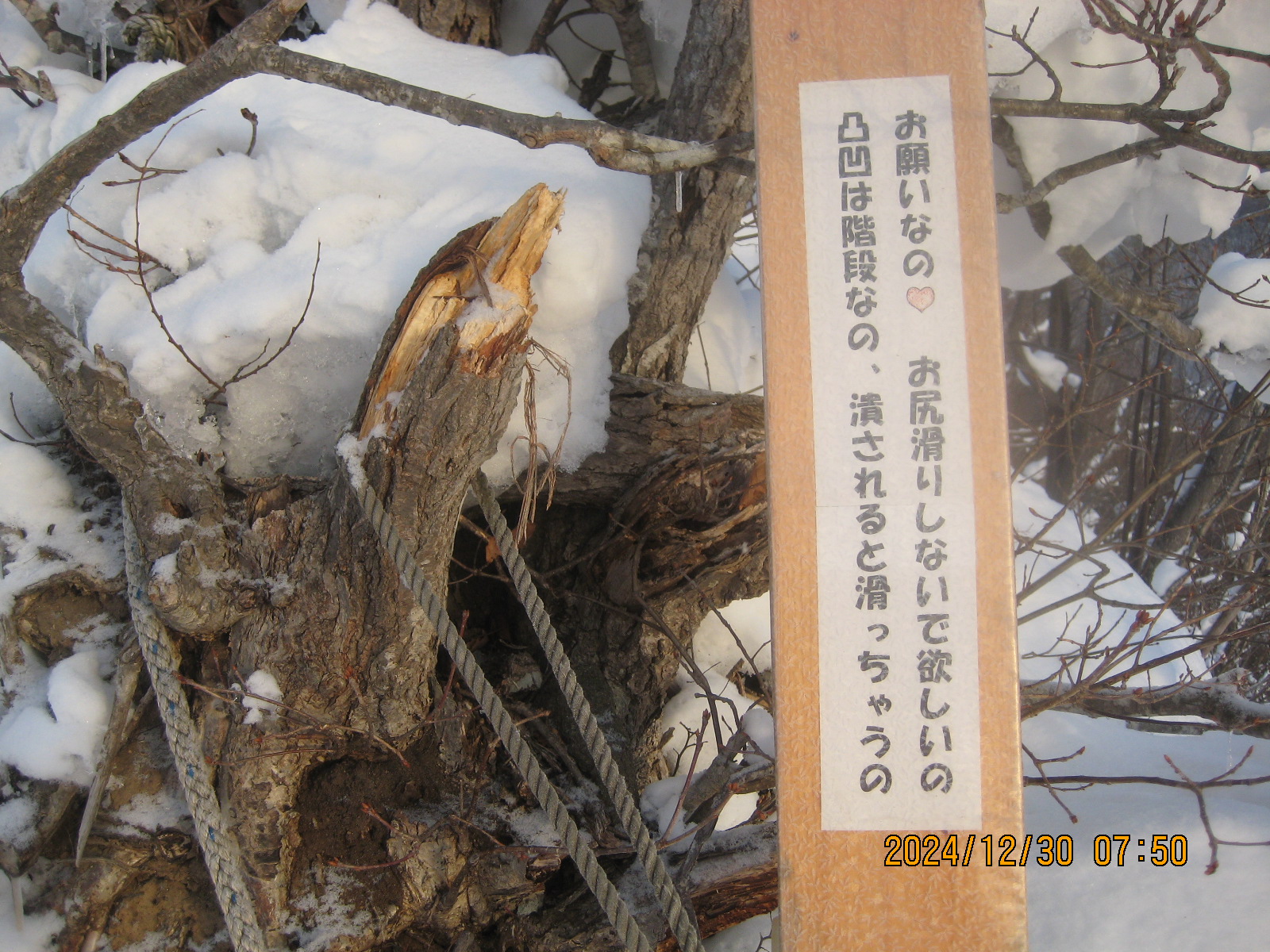 八剣山 登山開始7時5分 登頂7時47分 下山8時12分。 9日ぶりにお山に登りましたよ。 今年最後の八剣山なので頂上ではお礼やら報告やら一年最後のご挨拶をして来ましたよ。 9合目にはお尻滑りダメよの看板をぶら下げてきました。 何時もSuさんがスコップで階段を作って下さるので助かっています。 壊さないで欲しいですね。 来年も宜しく―。