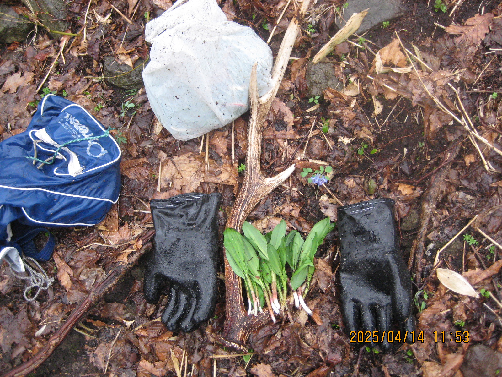八剣山 登山開始9時23分 登頂10時23分 下山12時2分。 ザザ降りの中でしたが根性で山中を歩き回ってきました。 アイゼンを持たずにスパイク長靴でしたので滑り落ちたりして体力消耗。 今度はアイゼン必携ですね。 収穫は雄鹿の角一本とアイヌネギ(ギョウジャニンニク)を袋に二つ。 登山小屋までの道路が開通しましたよ。 今日の雨は強烈で雪が融けるので、明日にはスイスイと通りやすくなるでしょう。